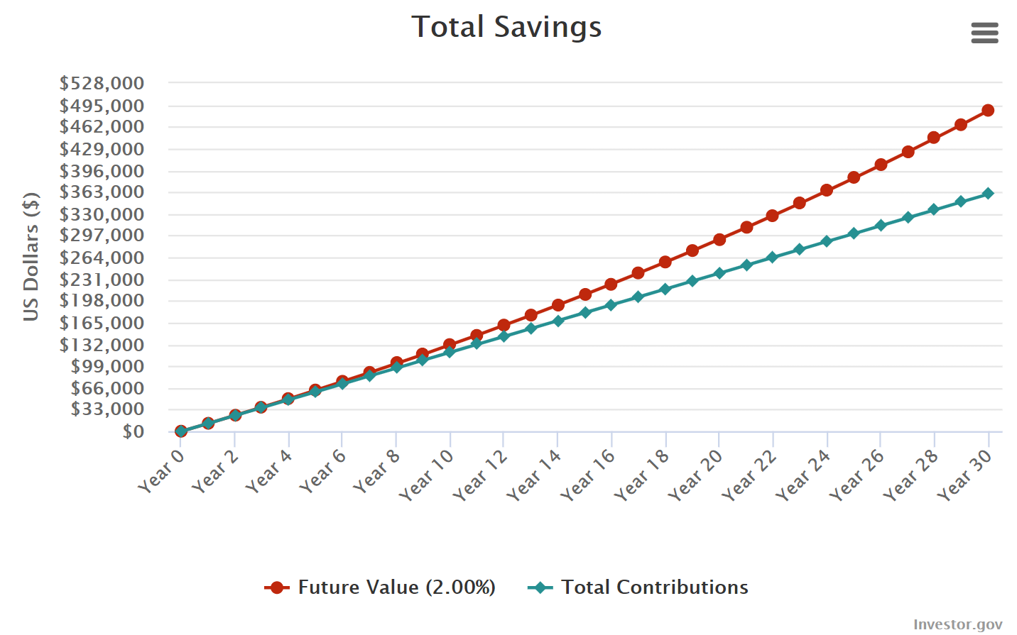 The chart below shows a $1,000 investment per month for 30 years, with a fixed rate of return of 10%.