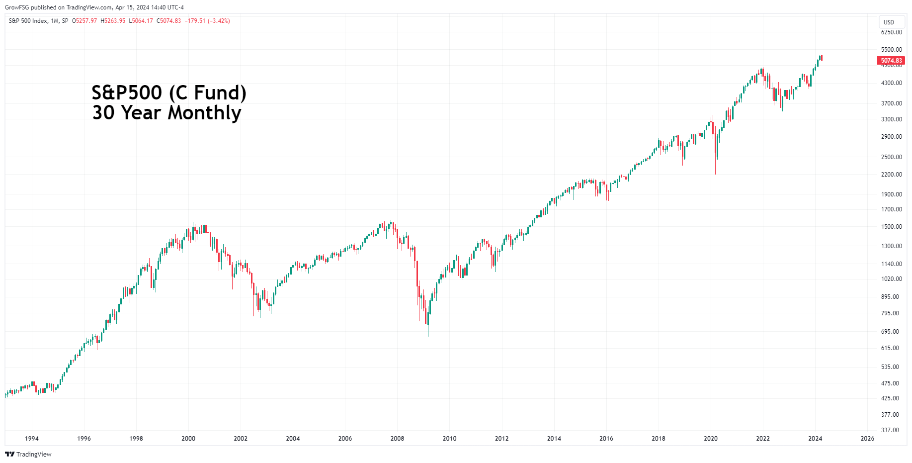 If you were fully allocated in the C fund over the past 30 years, the value of your account would look much more volatile as the chart below shows.