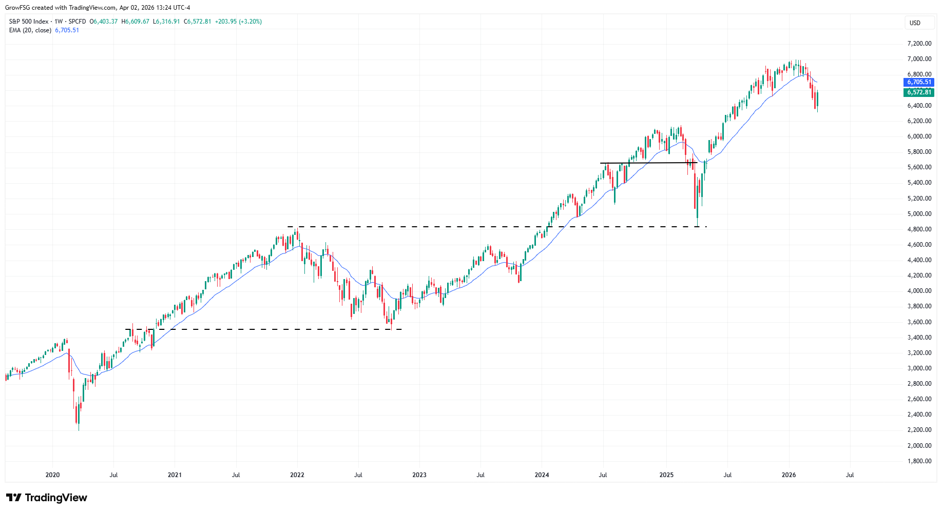 We can see that the 2022 bear market ended at the first major consolidation channel coming off the Covid bottom. Likewise, the 2025 correction ended at the January 2022 peak. Prior highs frequently provide support for future corrections.