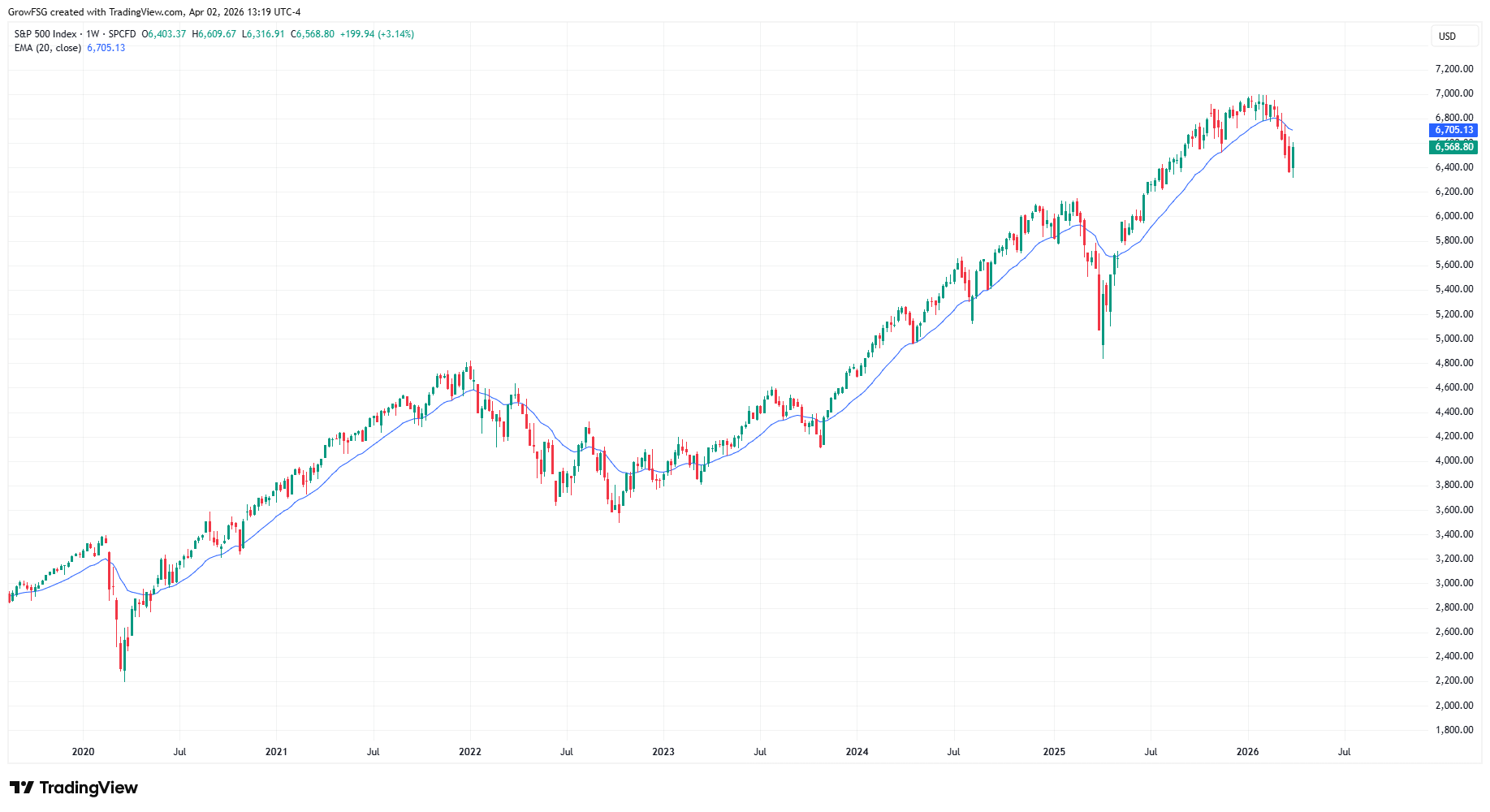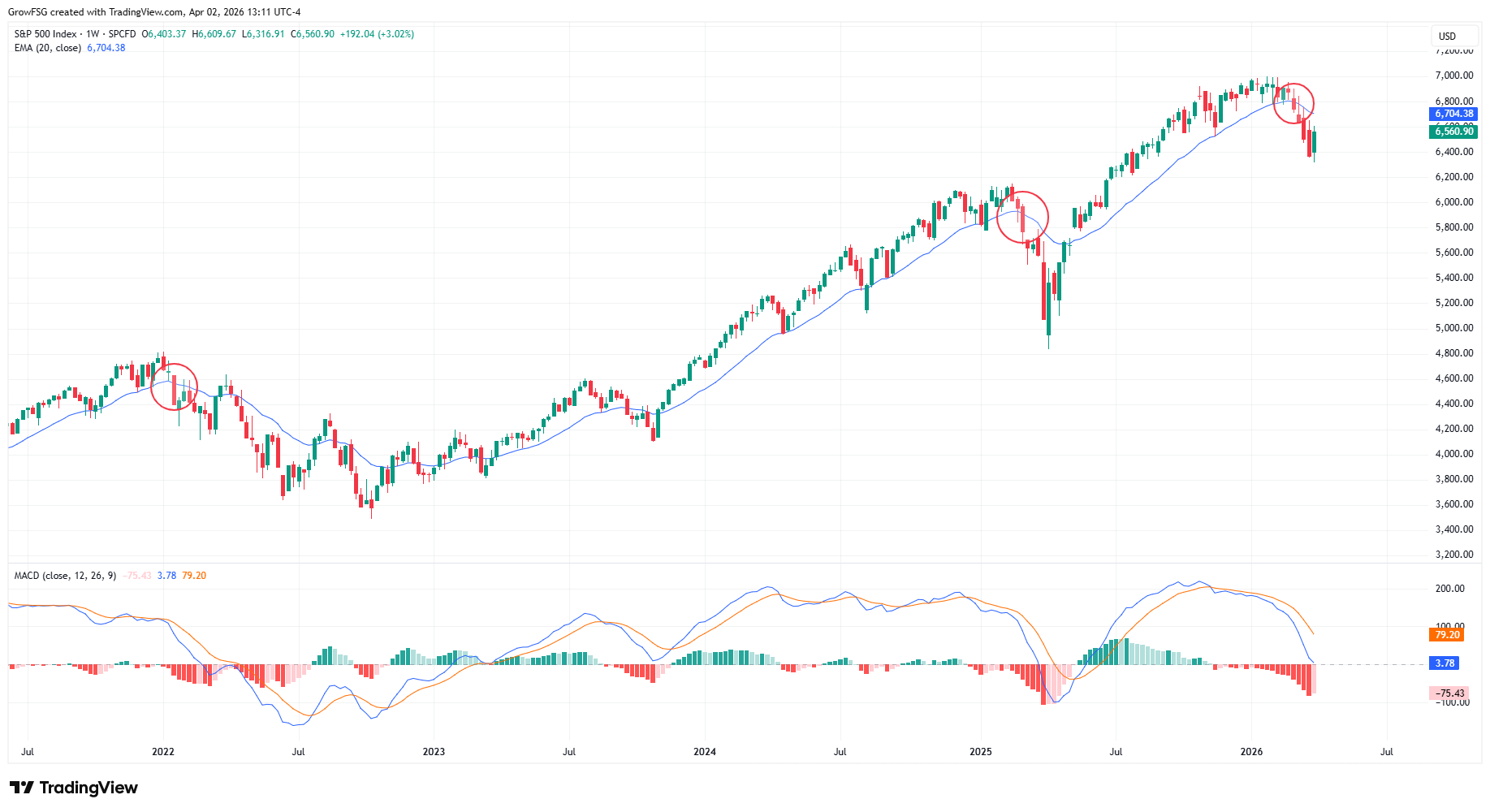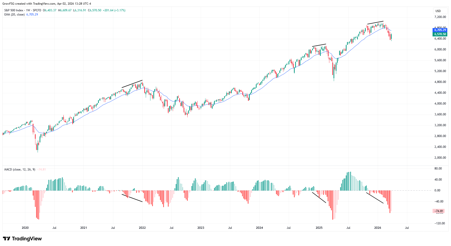 In early March 2026, the S&P500 had been in a rally since the April 2025 bottom. Momentum (MACD) turned negative in November and continued to decline. A weekly closing price below the 20WMA occurred on Friday, 06 March.