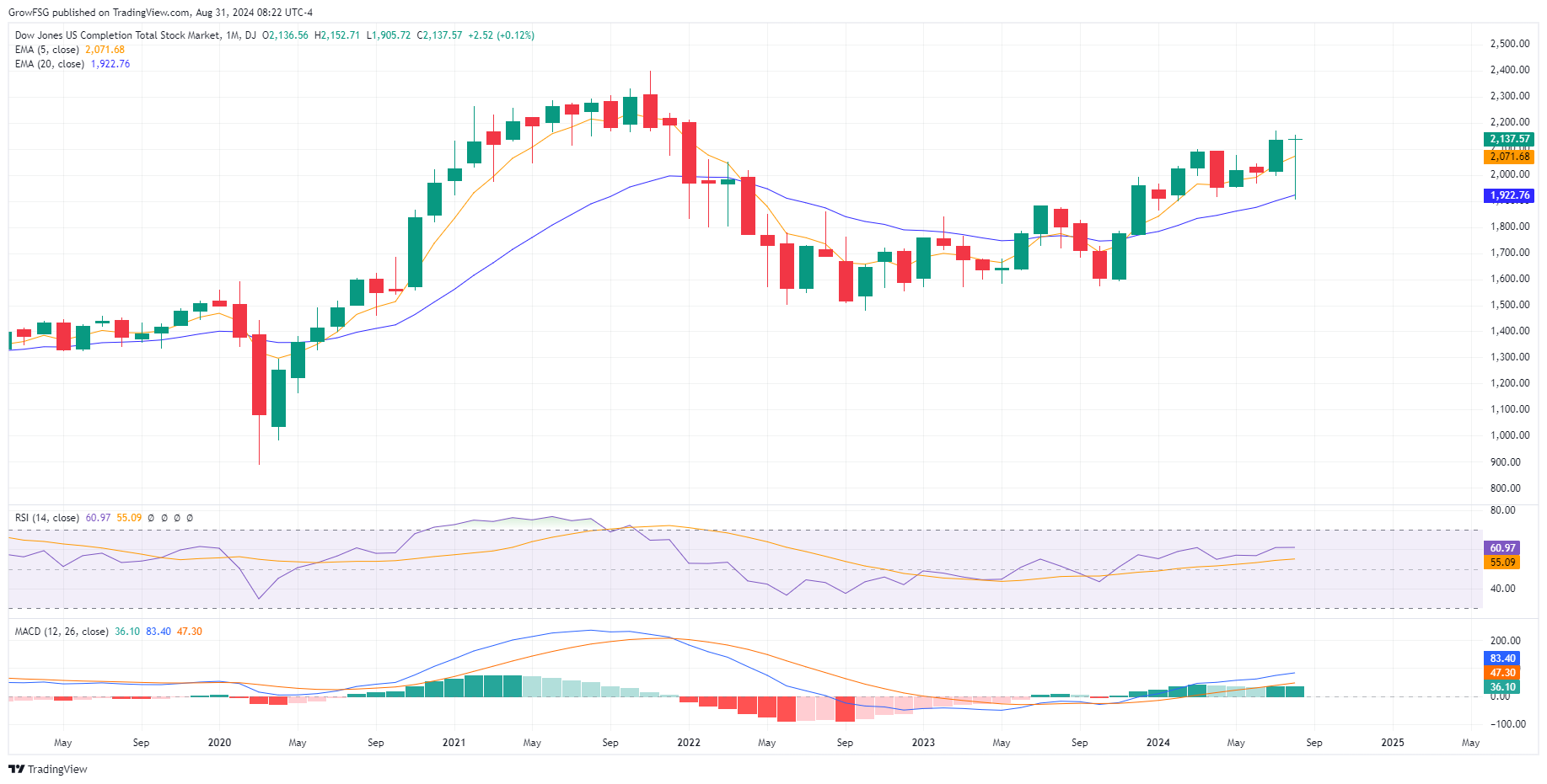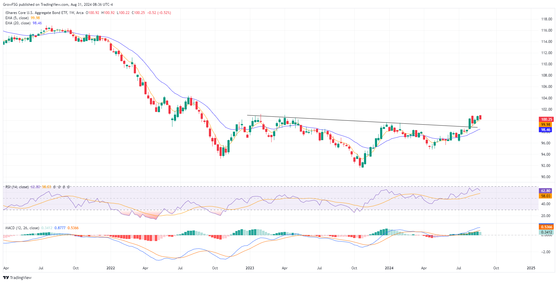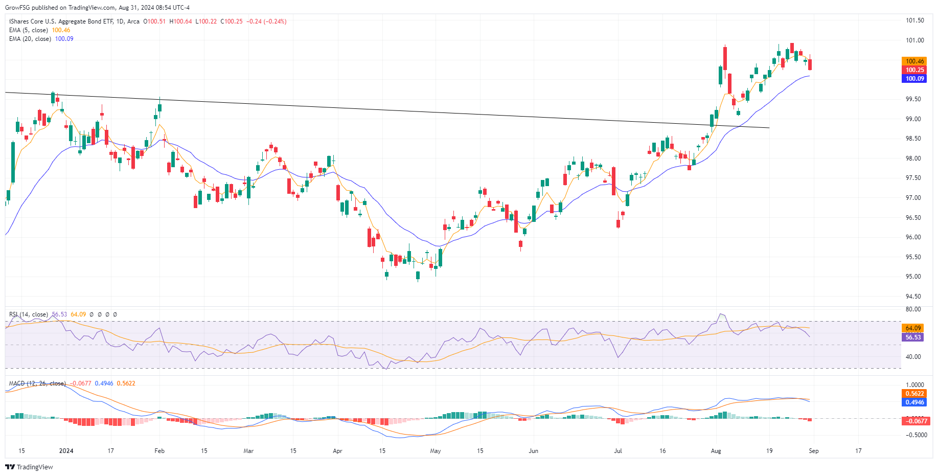 The F fund broke out through the neckline in late July, came back and retested the line, and then continued higher. The rally has stalled with RSI rolling over and MACD turning negative on a daily basis. We expect to see the 20DMA and 50 RSI line act as support on this pullback. While it is hard to envision a scenario where the F fund corrects significantly from here, we will let price action be our guide. The price of the F fund moves inversely to interest rates. If the F fund moves lower, it means that interest rates are rising. We know that the FED is expected to begin a rate cutting cycle in September. All indications are that interest rates will come down. If they do not, the S fund rally will fail as it is dependent on the expectation of lower rates. The economy is in a very tenuous place. We need to let it play out and respond to price action.