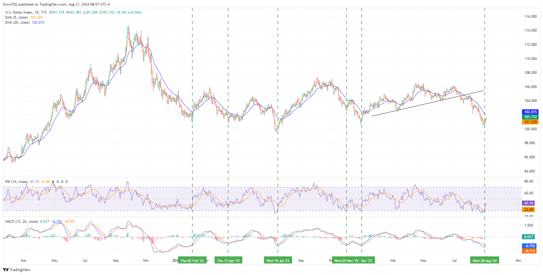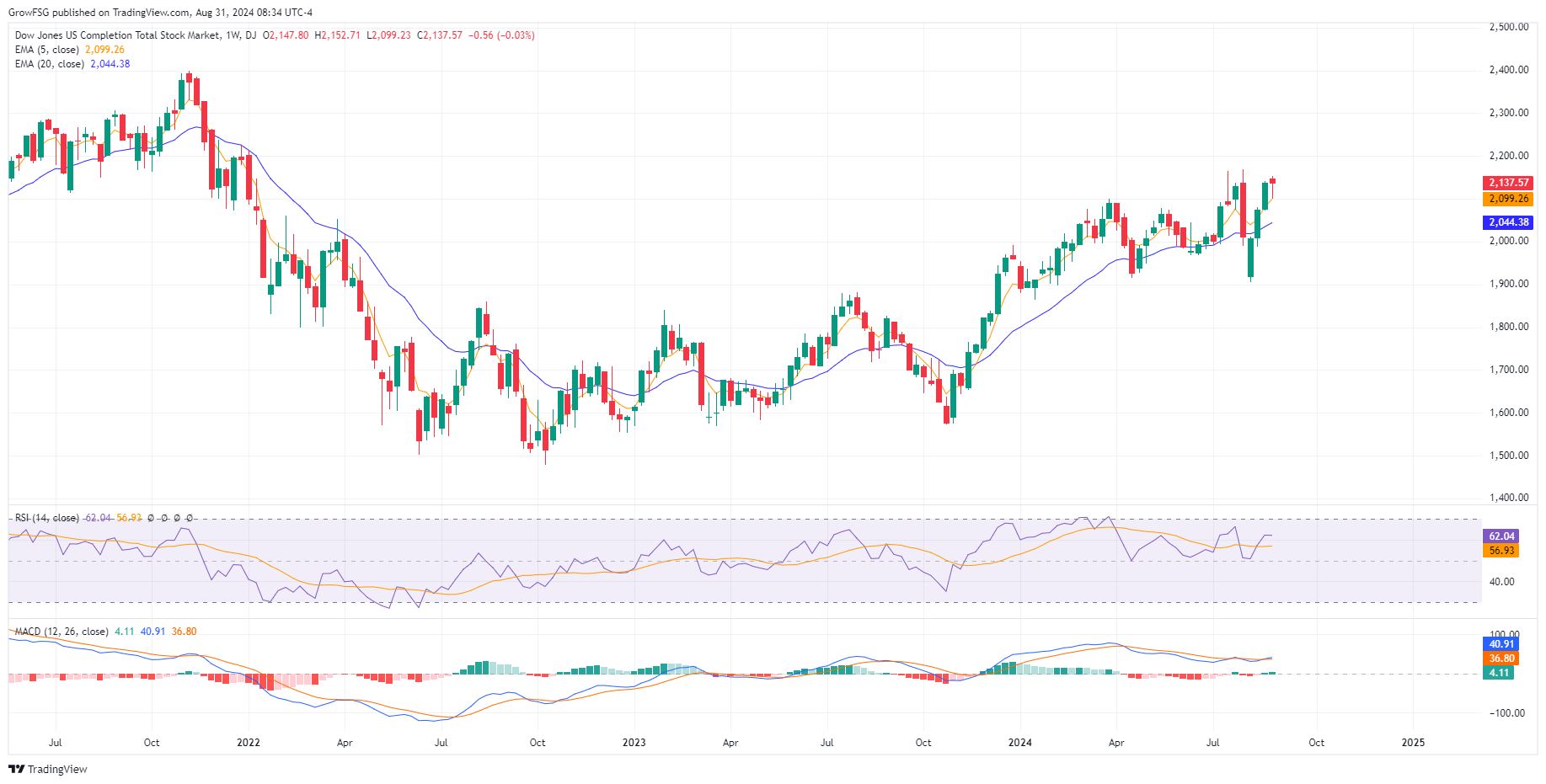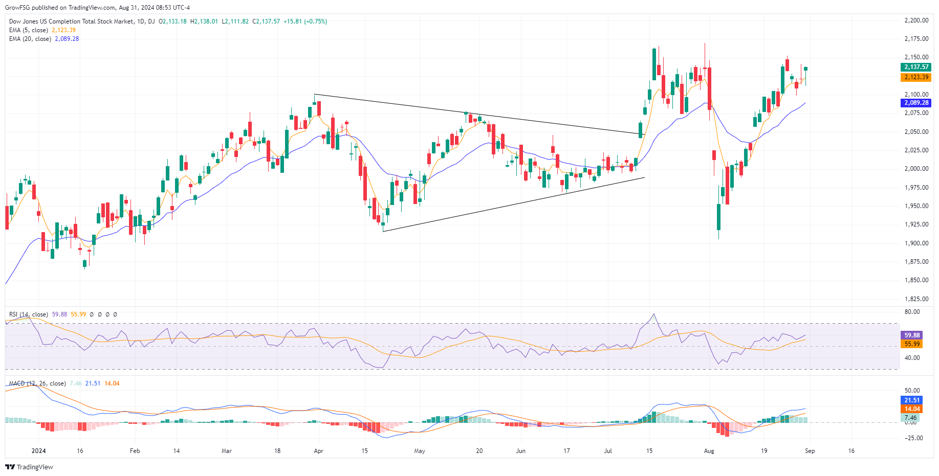 The F fund broke out through the neckline in late July, came back and retested the line, and then continued higher. The rally has stalled with RSI rolling over and MACD turning negative on a daily basis. We expect to see the 20DMA and 50 RSI line act as support on this pullback. While it is hard to envision a scenario where the F fund corrects significantly from here, we will let price action be our guide. The price of the F fund moves inversely to interest rates. If the F fund moves lower, it means that interest rates are rising. We know that the FED is expected to begin a rate cutting cycle in September. All indications are that interest rates will come down. If they do not, the S fund rally will fail as it is dependent on the expectation of lower rates. The economy is in a very tenuous place. We need to let it play out and respond to price action.