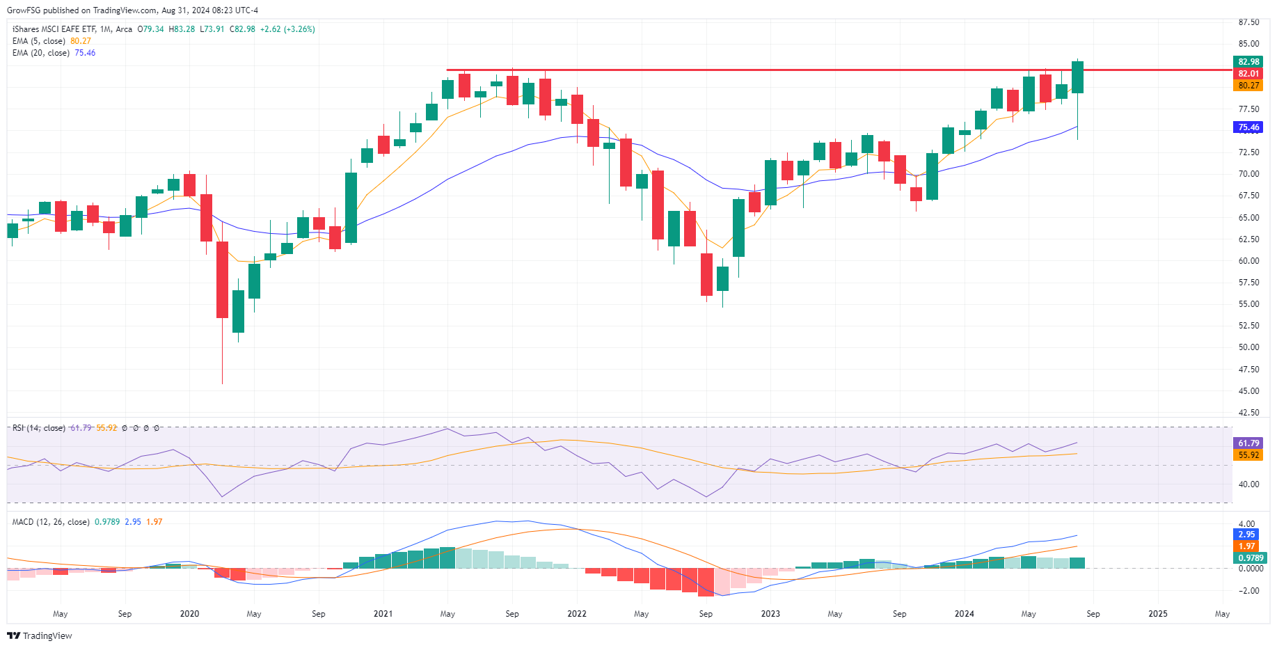 The I fund finally closed a month above the 82 level. This has been resistance since mid-2021. While it was an extremely volatile month for the I fund, this closing price is significant. With RSI having room to move higher and MACD expanding to the upside, the I fund is looking very strong on a monthly basis.