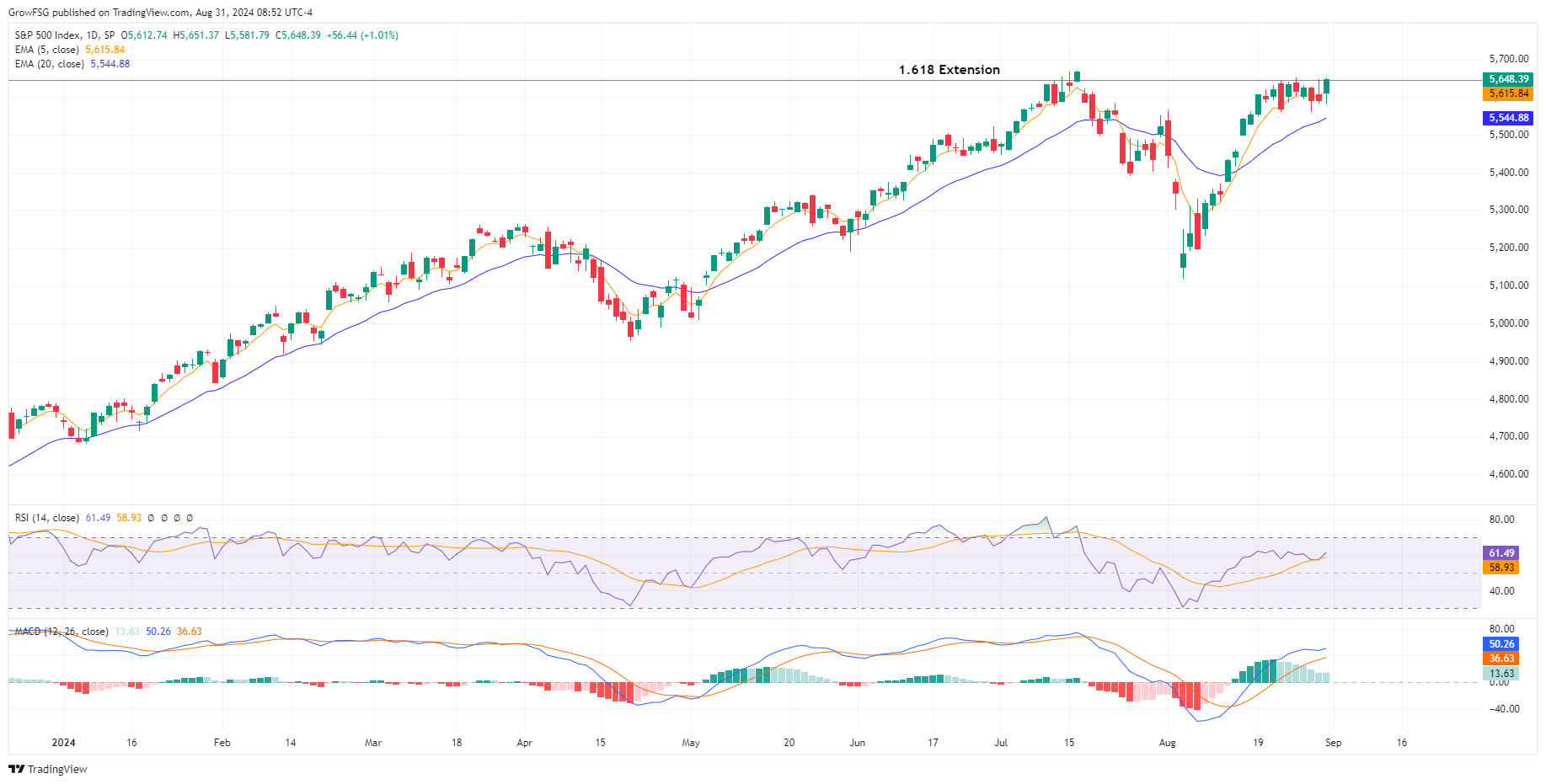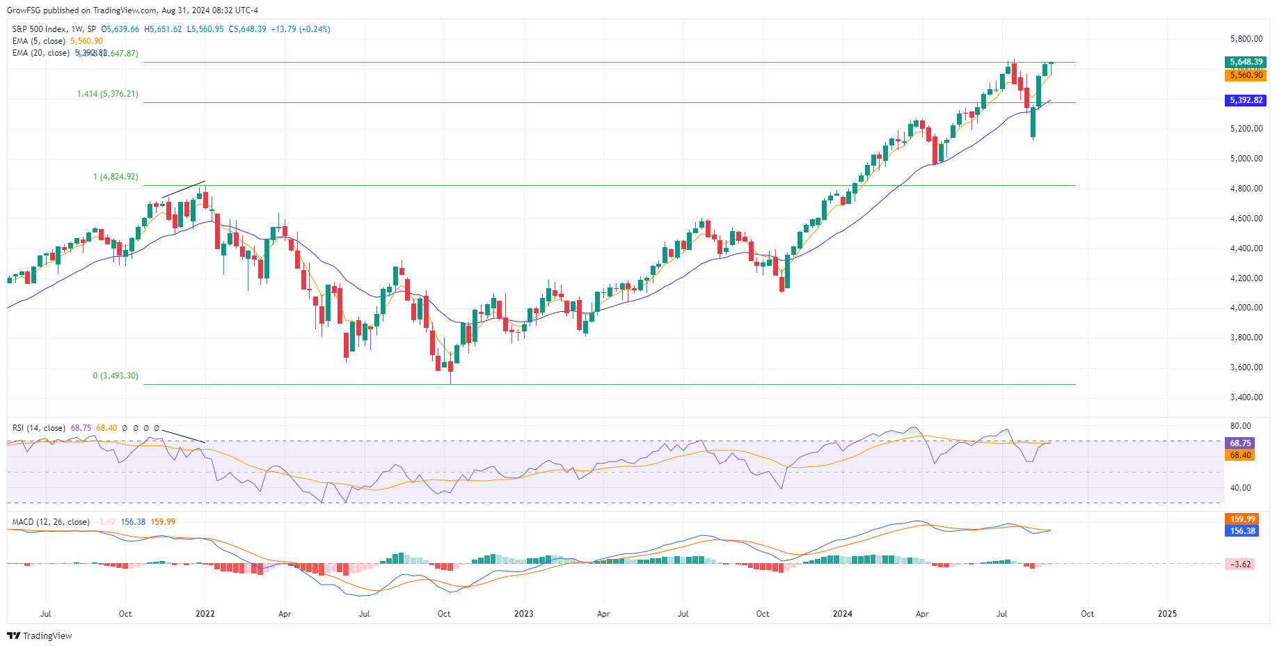 Friday's afternoon rally pulled the S&P500 into the green for the week. Trading volume on Friday was significantly higher than it has been since the beginning of August. This is unusual given it was the Friday before the long Labor Day weekend. The S&P closed higher for the day, the week, and put in a new monthly all-time high. Investors are clearly not concerned about holding long positions going into the most volatile months of the year for the market. This is all very bullish price action. For the week the C fund finished up 0.24%, S fund down 0.03%, I fund up 0.19%, and the F fund down 0.52%.