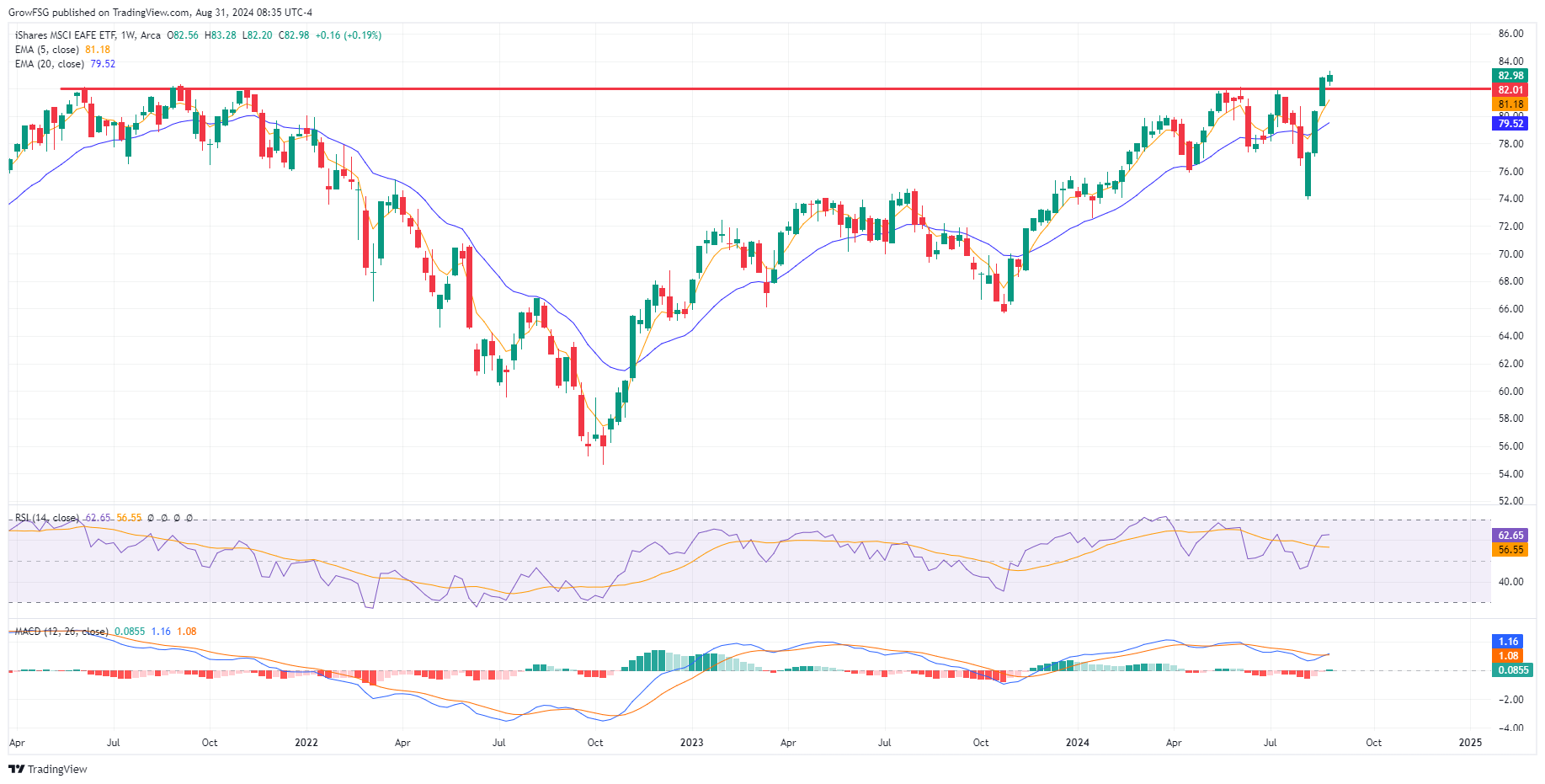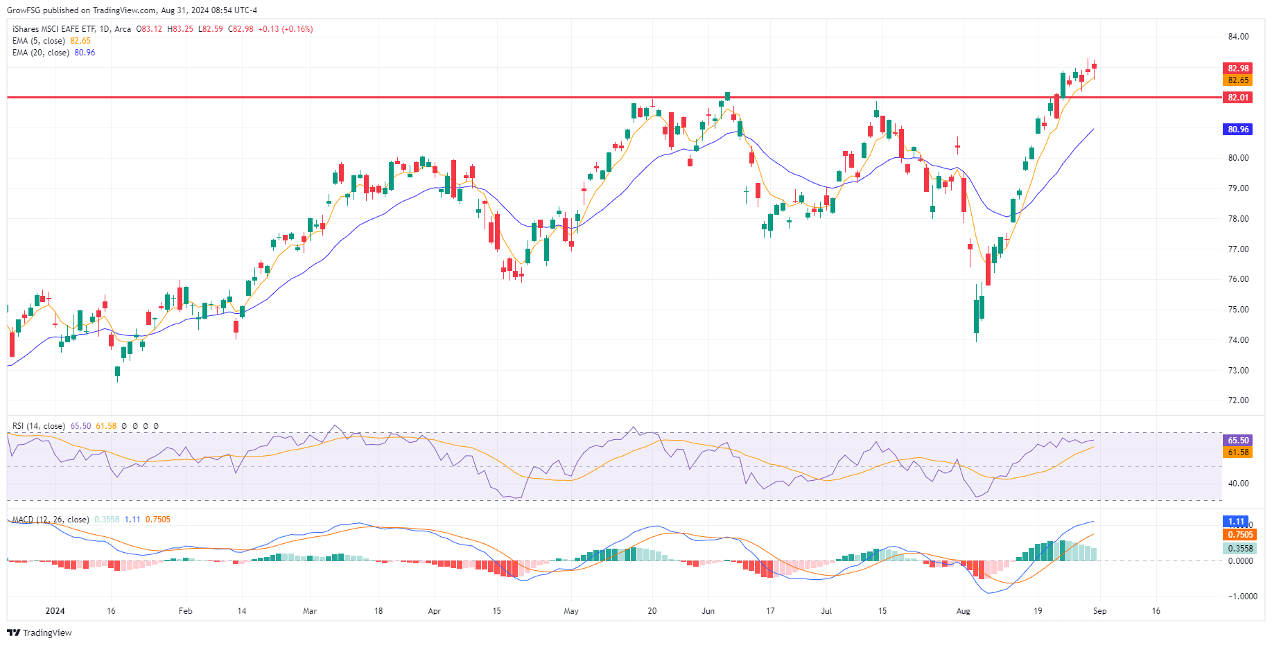 The I fund rally has been very strong off of the early August low. We can see the weakening at this point as RSI and MACD begin to stall. Ideally, we see an orderly pullback to the 82 level or the rising 20DMA line before a resumption of the uptrend. It really comes down to the direction of the Dollar.