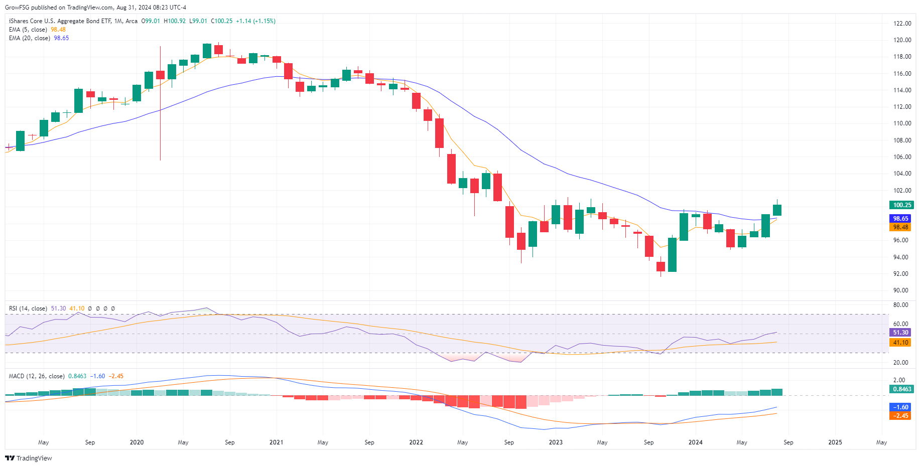 The rally in the F fund continued this month as the 5 month moving average is about to cross above the 20 month moving average. This is a very bullish cross that we have not seen since mid-2019. We now have a clear uptrend on a monthly basis with a higher low and a higher high. RSI just broke through 50 and MACD is expanding, giving the F fund plenty of room for gains before becoming overvalued.