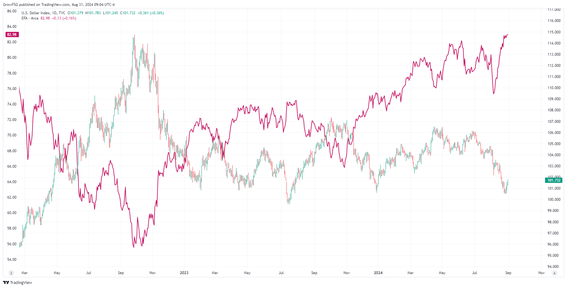 This is the same chart showing the dollar in candlesticks and the I fund in red. You can see the inverse correlation between the dollar and the I fund. While not an exact inverse correlation on a daily basis, a strengthening dollar is clearly a drag on the I fund.