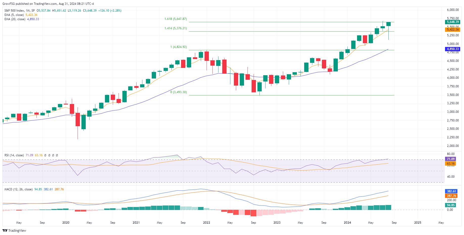 Friday was the last trading day of August, giving us an opportunity to study the very long term, monthly candlestick charts over a long 3 day weekend. The monthly candle charts show us the very long term trend. For the C fund, the trend is clearly up. August closed at a new all-time high with a very bullish hammer pattern. While we saw significant weakness early in the month, buyers stepped in and bought the dip. Price has not been able to clear the Fibonacci 1.618 extension level. Until this level is taken out, there is some reason for concern. On the other hand, we can see the value of the 5 month moving average line (yellow). As long as price stays above this line, the rally is clearly in place. We also see RSI and MACD continuing to expand to the upside. On a monthly basis, the trend in the S&P500 is very strong.
