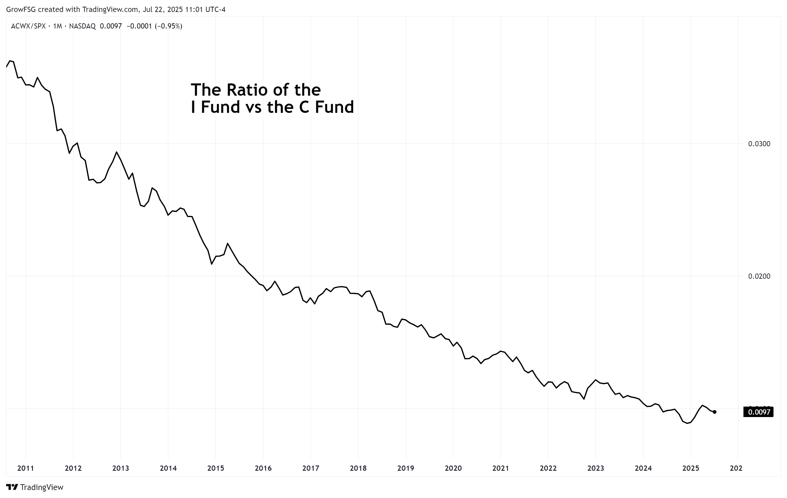 The chart shows the ratio of the I fund vs the C fund. When the line is trending down, the C fund is outperforming the I fund. When the line is trending up, the I fund is outperforming the C fund. The long-term chart has been in a clear downtrend since 2010.