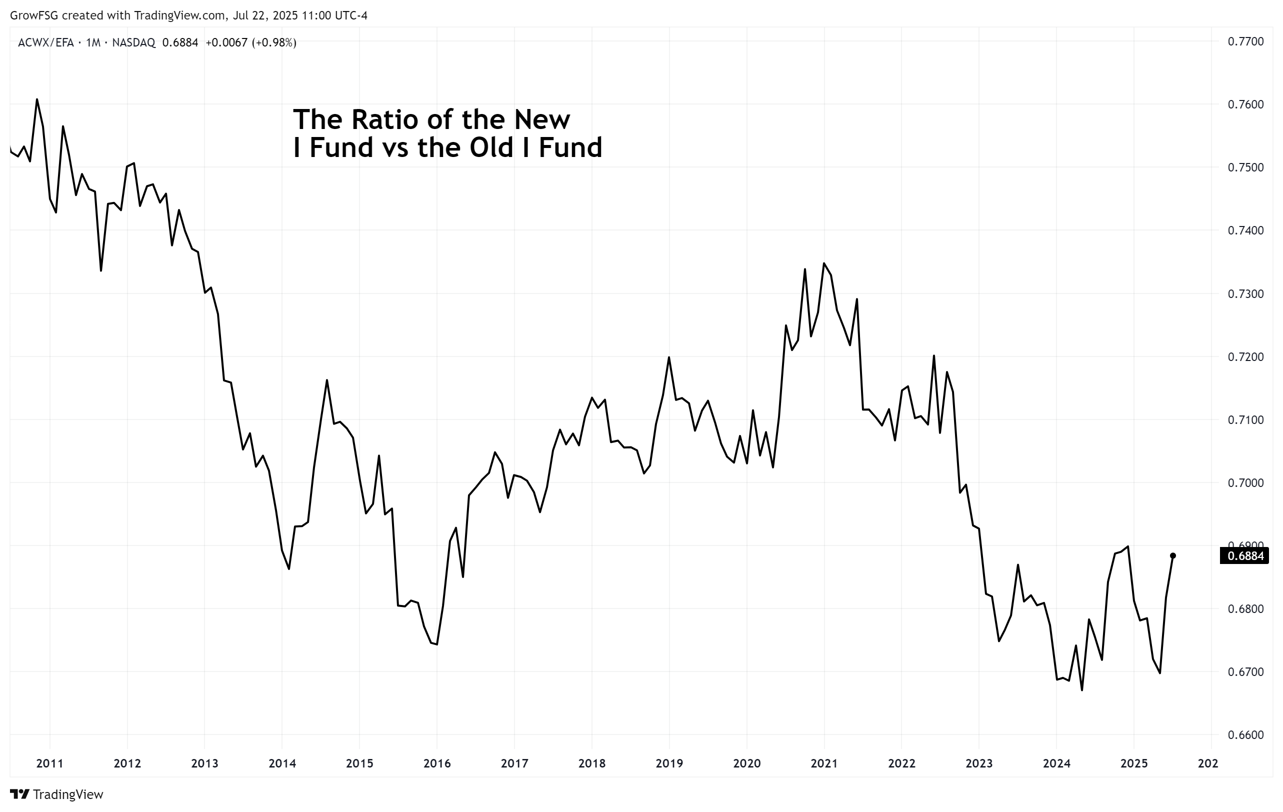 As TSP investors, we can squabble amongst ourselves as to whether the new I fund is better than the old I fund. The chart below shows the ratio of the ACWX (new I fund approximation) vs the EFA (old I fund).