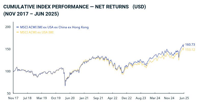 This new index is essentially the same as the MSCI ACWI IMI ex USA Index but excludes China and Hong Kong, which account for approximately 10% of the index. The transition from the "Old" I fund to the "New" I fund was completed in September 2024.