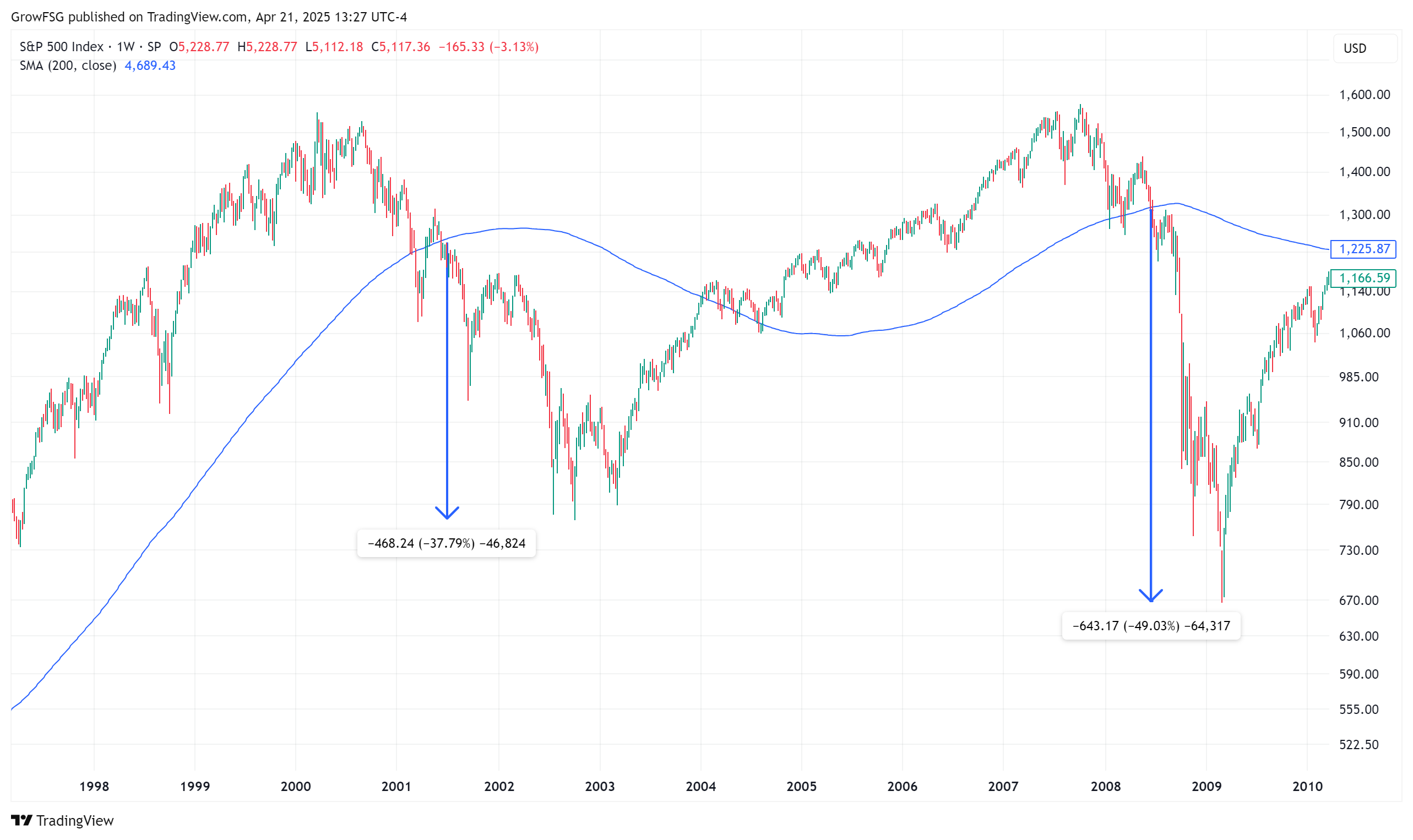 Following the 1929 market crash, stocks recovered for several years before falling below the 200WMA in 1937 and staying below it until 1943.